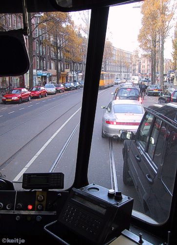 de tram moet maar even wachten totdat de stilstaande file de gedistingeerde grijze auto laat doorrijden.